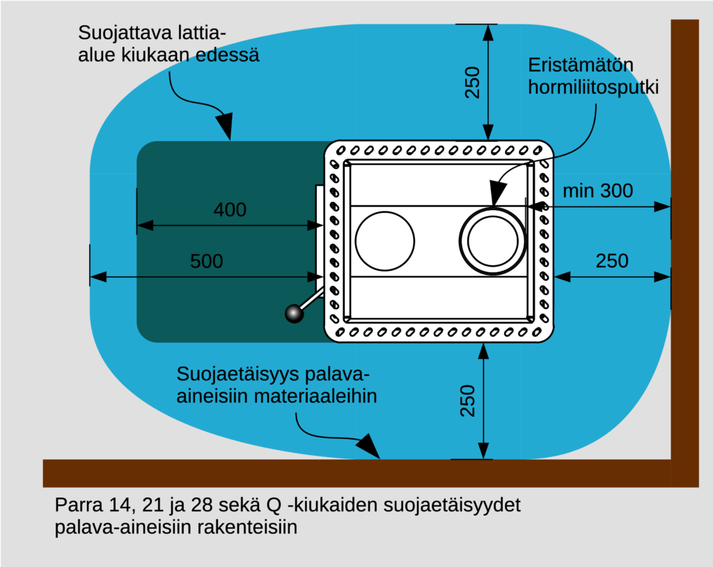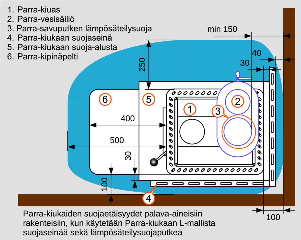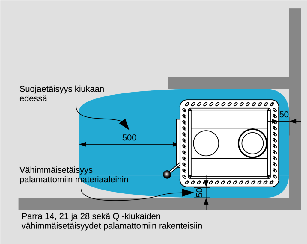 Voidaan pienentää 100 mm:iin käyttämällä lisävarusteena saatavaa Parra-kiukaan suojaseinää. Tällöin tarvitaan myös liitoshormin lämpösäteilysuoja.